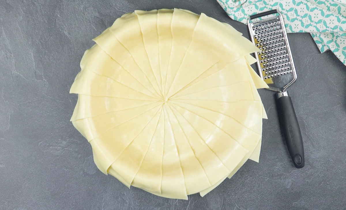 6. Lege aus den in Streifen geschnittenen Lasagneplatten ein Gitter auf die Auflaufform. Schneide den überlappenden Teig ab und streiche das Gitter mit flüssiger Butter ein. Schiebe die Form bei 180 °C Ober- und Unterhitze für 45 Minuten in den Ofen.
