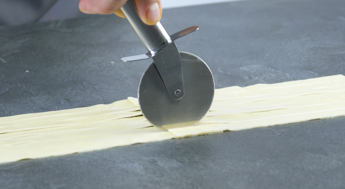 4. Das letzte Drittel der Lasagneplatten schneidest du längs in ca. 1 bis 2 cm dicke Streifen.