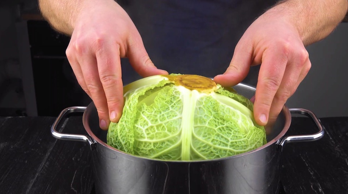 So geht es: 1.) Koche einen Wirsingkohl ca. 10 Minuten in heißem Wasser.