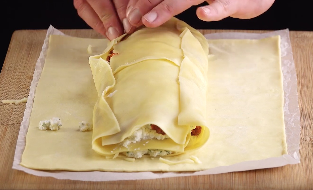 5.) „Verpacke“ die Lasagne nun, indem du die an den Seiten abstehenden Nudelplatten nach oben klappst und sie an der Oberseite behutsam festdrückst.