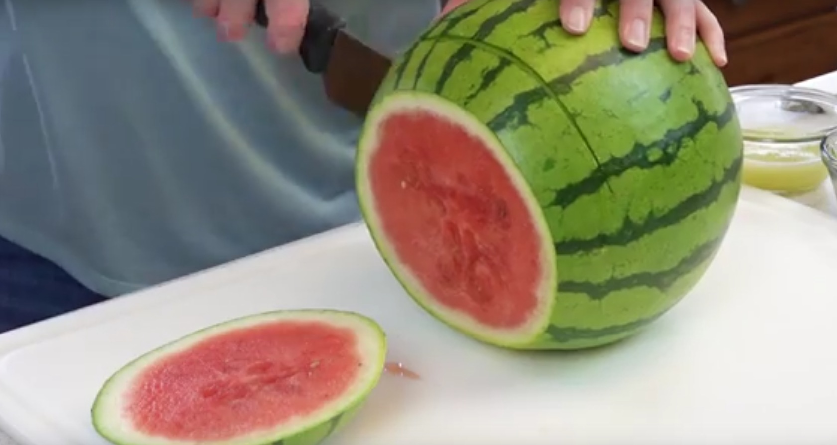 Du brauchst eine schöne, runde, frische Wassermelone, die innen noch fest sein sollte. Die Seiten musst du einfach abschneiden.