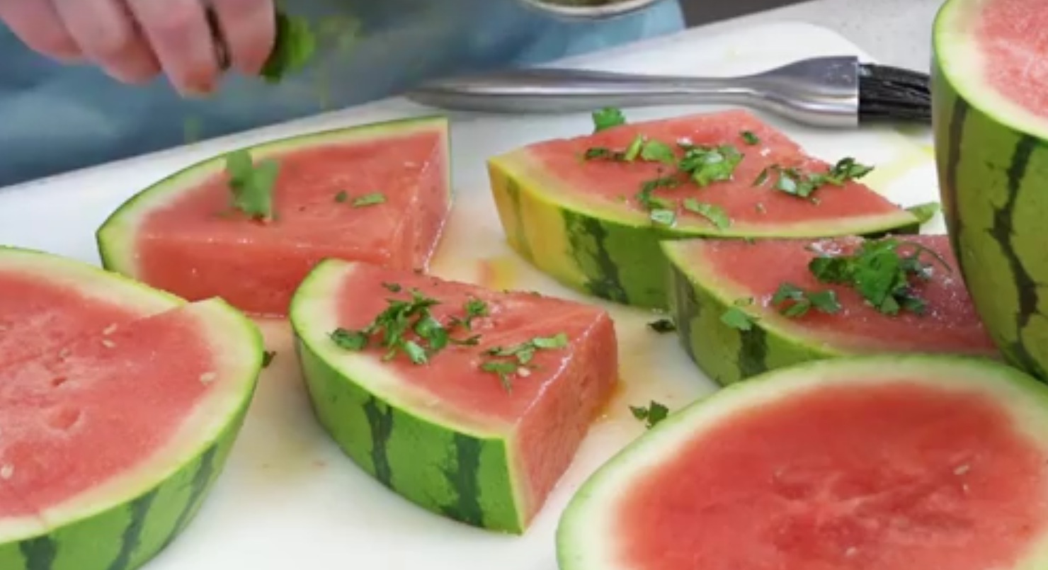 Um den besonderen Geschmack der Wassermelonen zu betonen, gib eine Prise Salz über die Melone und zum Abschluss noch etwas Koriander.