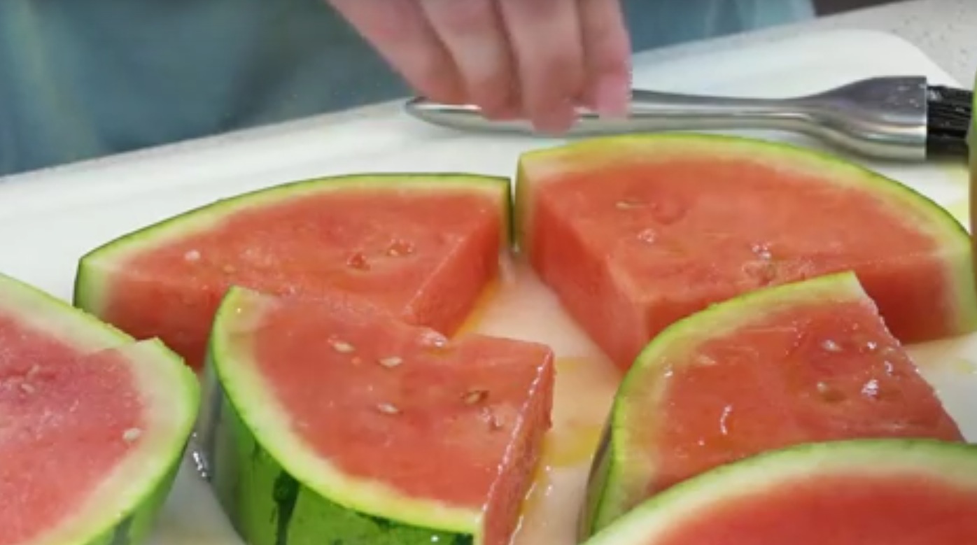 Als nächstes brauchst du einen Pinsel, mit dem du die Wassermelone mit Limetten-Saft bestreichst. Auf beiden Seiten!