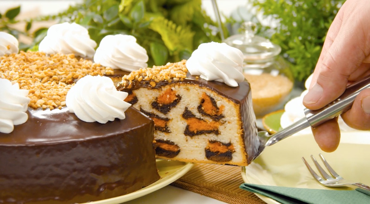Der Leopardenkuchen mit pfiffigem Leo-Twist, Schokoglasur, Haselnusskrokant und Sahne ist zu jeder Gelegenheit eine wahre Schönheit.