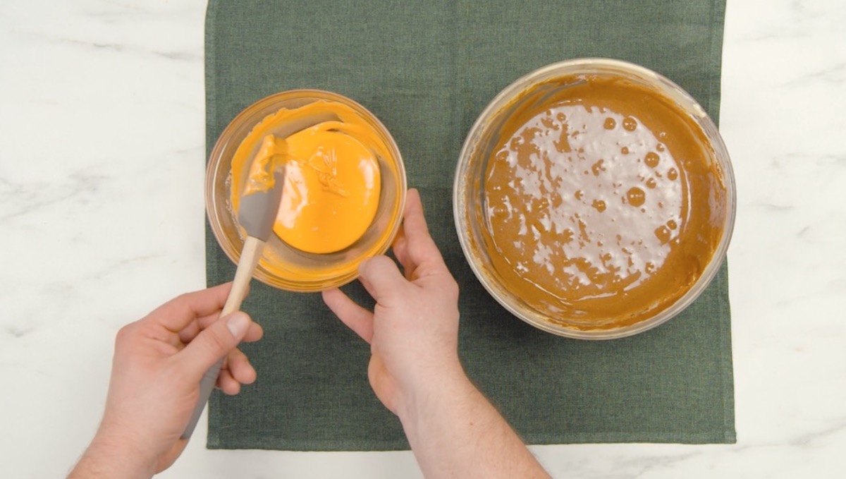 2. Schlage für den Eigelbteig das Eigelb mit Zucker und Vanille schaumig auf, rühre dann Öl, Milch und Mehl hinzu. Färbe 1/3 des Teiges mit Lebensmittelfarbe und vermische den übrigen Teig mit Kakao. Fülle beide Teige in je einen Spritzbeutel.
