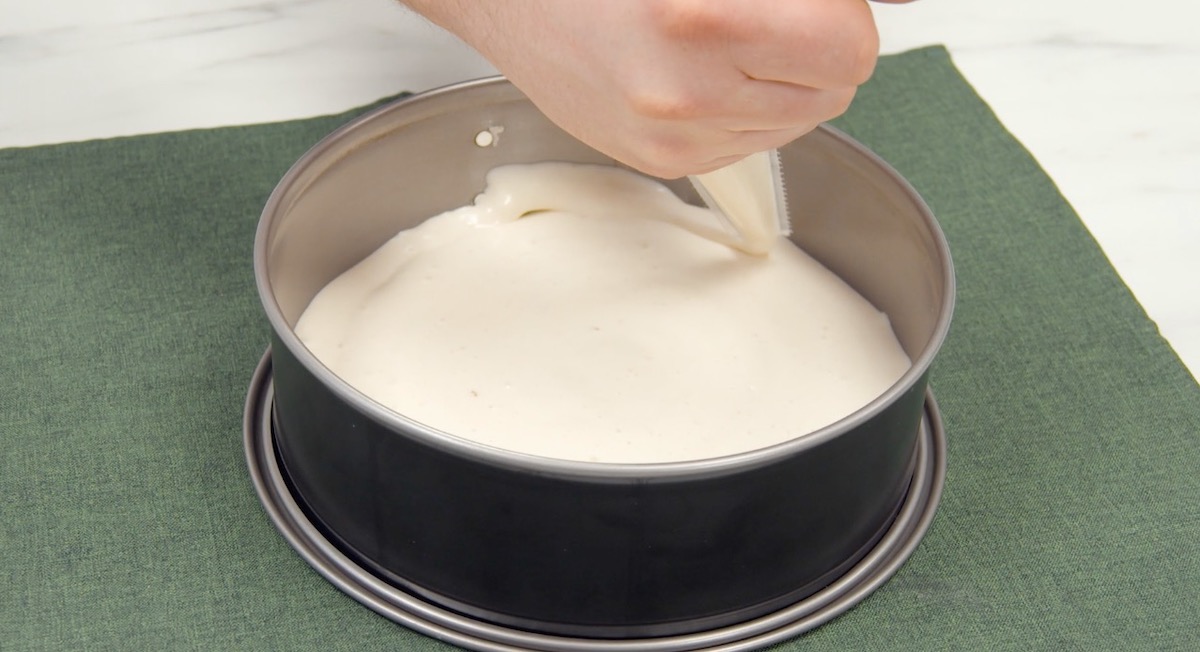 3. Fette die Springform ein. Spritze dann zunächst eine dünne Schicht vom Eiweißteig in die Form.