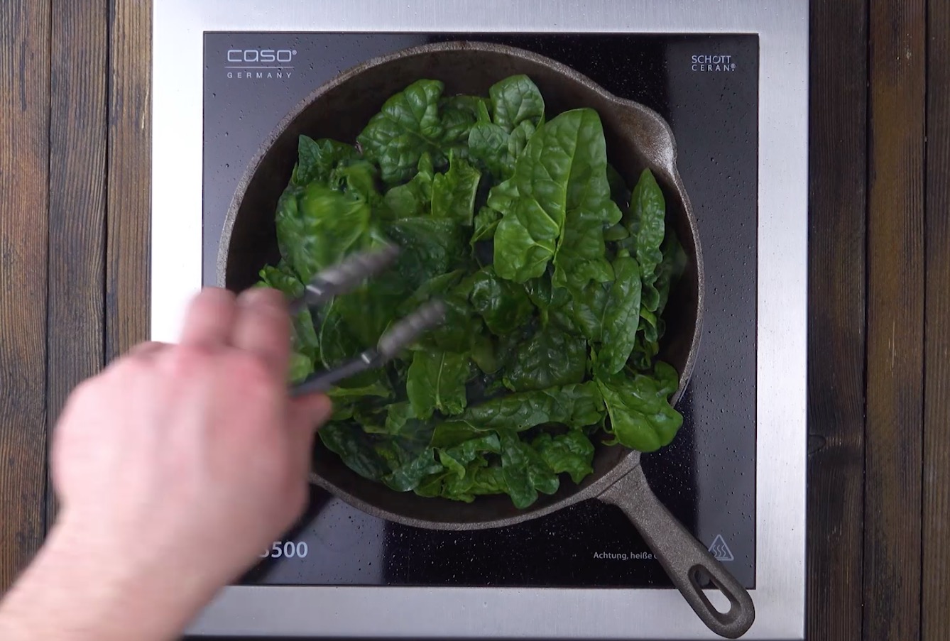 2.) Brate dann den Bacon in einer Pfanne an. Nimm ihn dann aus der Pfanne und brate den Spinat im ausgebratenen Fett des Bacons an.