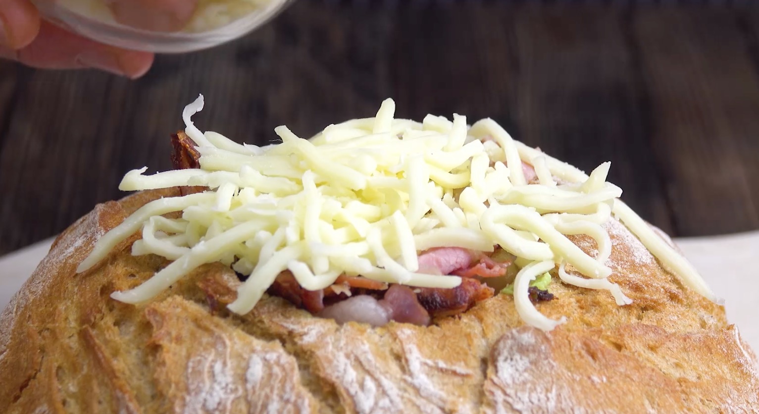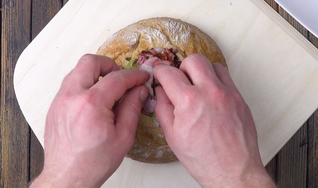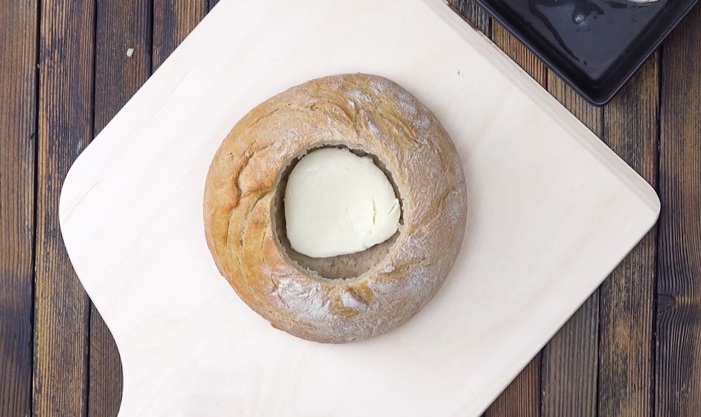 1.) Säge zunächst mit einem geeigneten Messer einen kreisrunden Einschnitt in den Brotdeckel und höhle das Innere des Brots anschließend so weit wie möglich aus. Lege dann die erste Scheibe Mozzarella hinein.