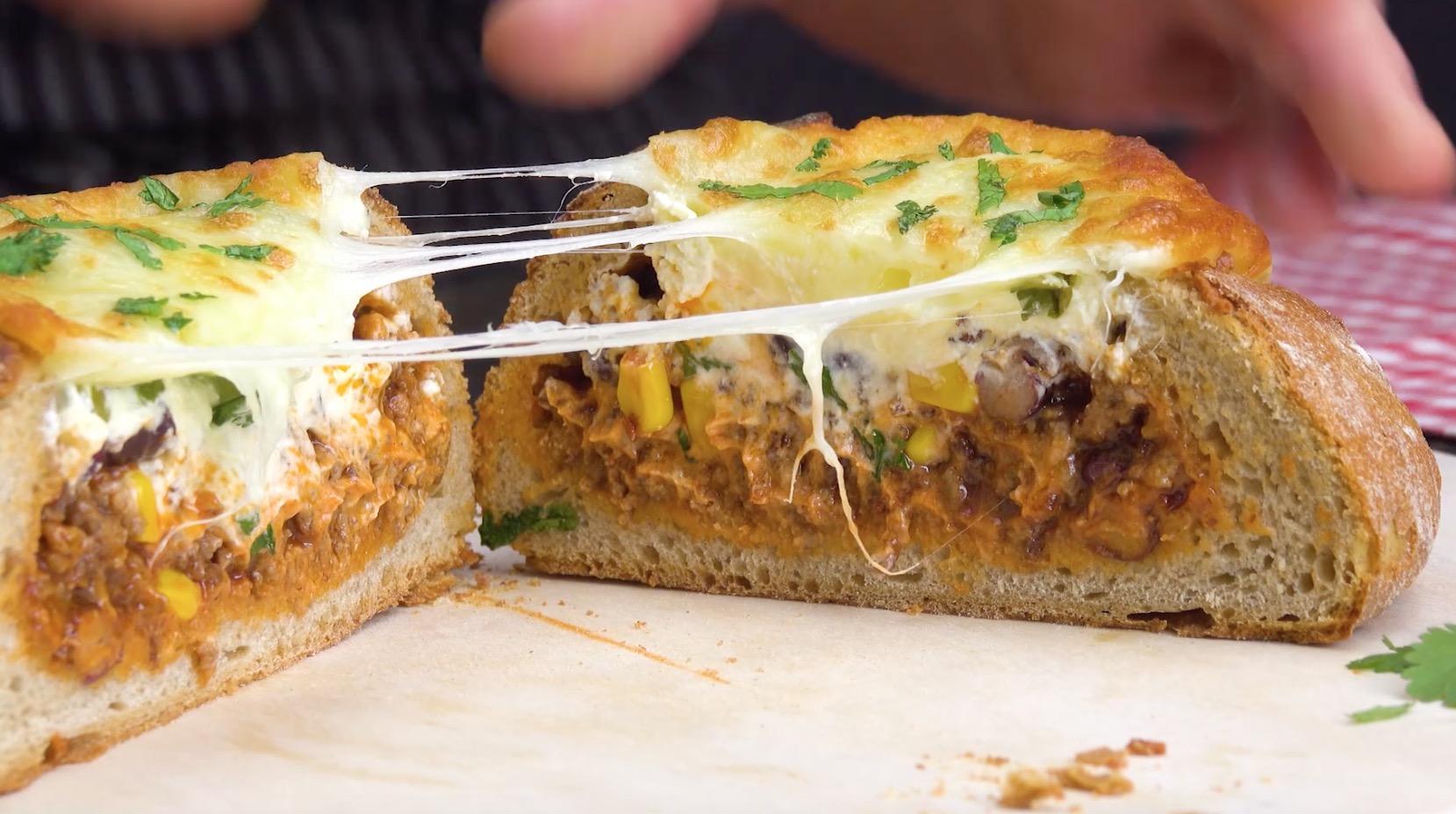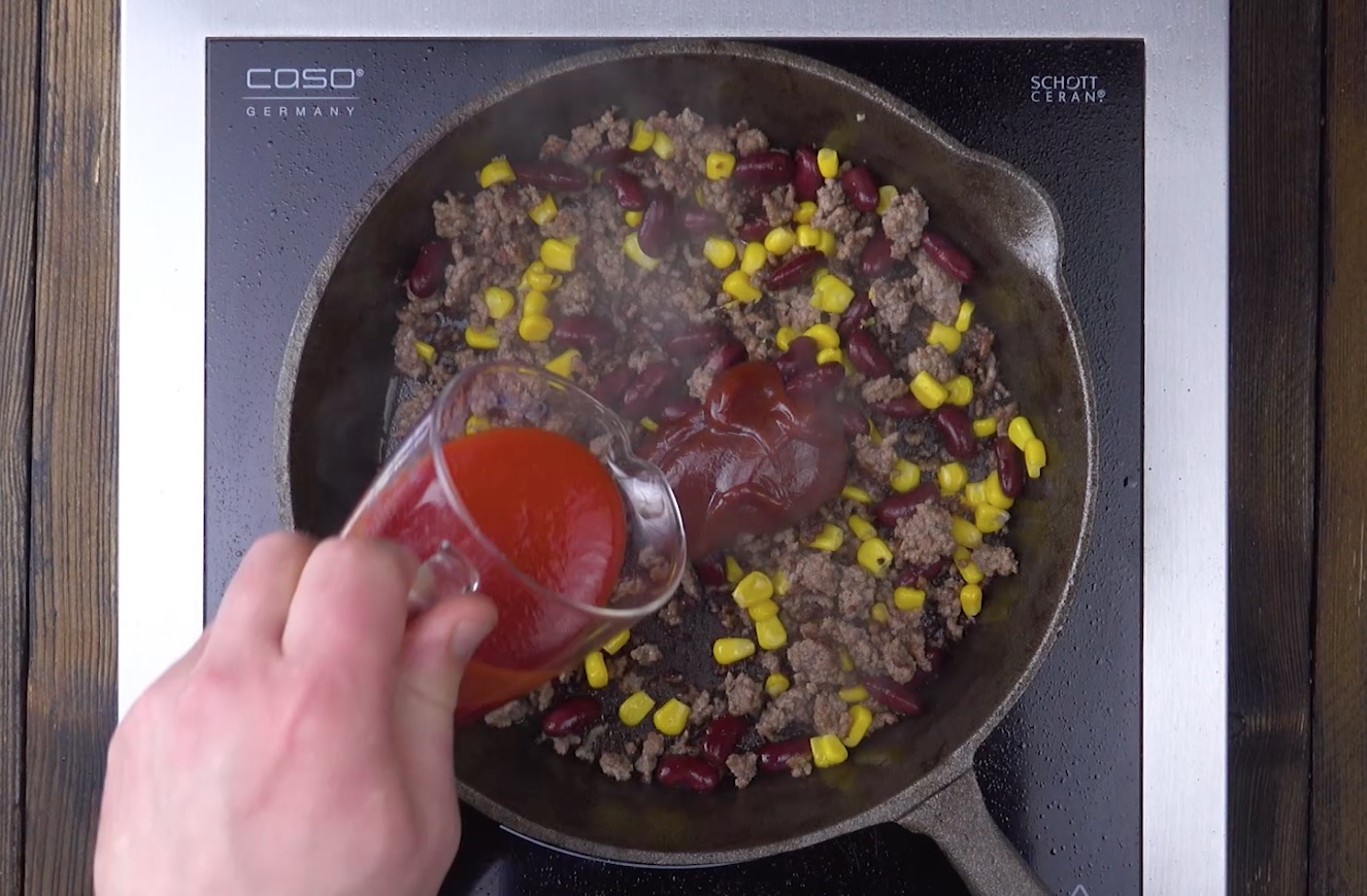 2.) Kümmere dich nun um das Chili: Brate zunächst das Hackfleisch in etwas Öl an und dann zusammen mit Mais und Bohnen etwas weiter. Anschließend würzt du mit der Barbecue- und der Tomatensoße. Lass die Mischung etwas köcheln und würze dann noch nach Belieben mit Salz und Pfeffer. Rühre noch einmal kräftig um und fülle die Mischung zum Schluss in das Brot.