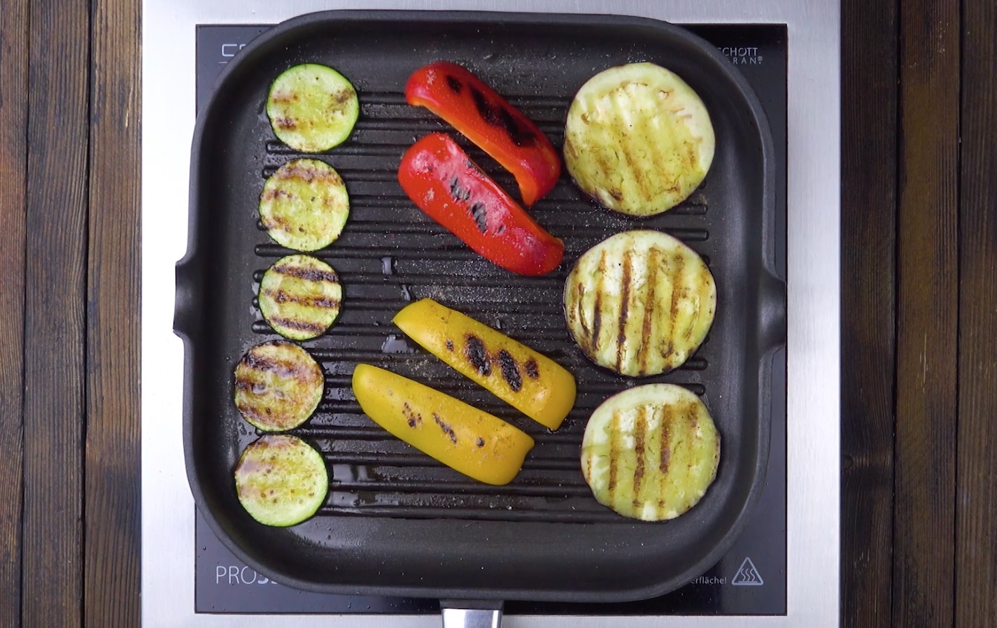 2.) Brate nun das Gemüse von beiden Seiten in reichlich Öl in einer beschichteten Pfanne an.