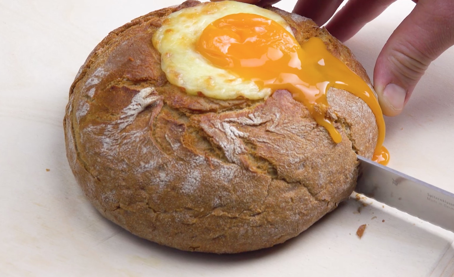 3.) Der Clou des Gerichts ist allerdings das Eigelb, das du nun als zweite Garnierung auf den Brotdeckel setzt. Zum Schluss schiebst du das Brot noch einmal für 5 Minuten in den Ofen, damit das Eigelb außen fest wird.