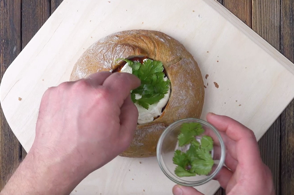1.) Säge zunächst mit einem geeigneten Messer einen kreisrunden Einschnitt in den Brotdeckel und höhle das Innere des Brots anschließend so weit wie möglich aus.