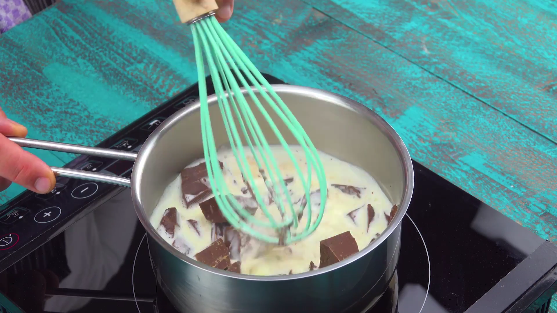 Für die Füllung erhitze die Sahne in einem Topf und füge die klein gehackte Schokolade hinzu. Unter stetigem Rühren erhitze beides so lange, bis die Schokolade vollständig geschmolzen ist.