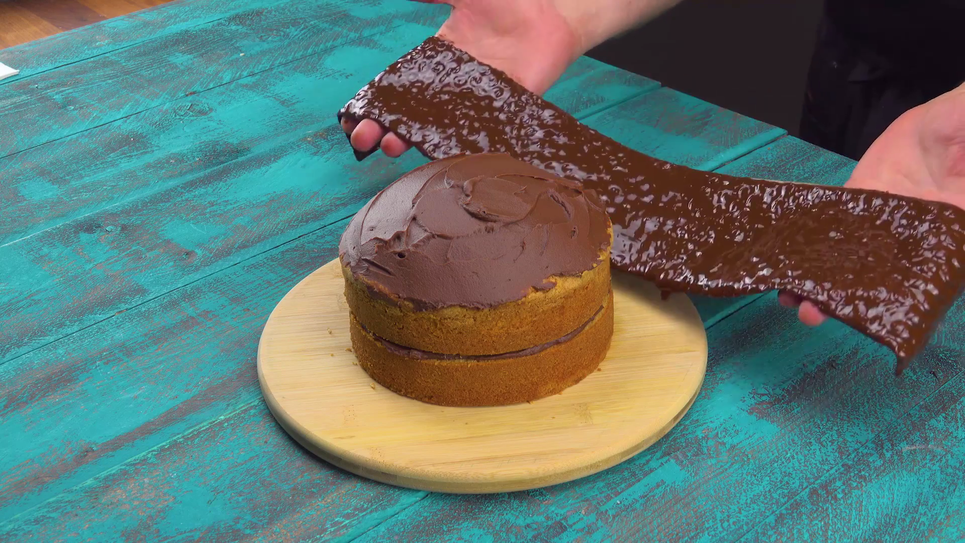 Die Schokolade sollte nun rund 10 Minuten an der Folie antrocknen, ehe du den Kuchen mit ihr ummantelst.