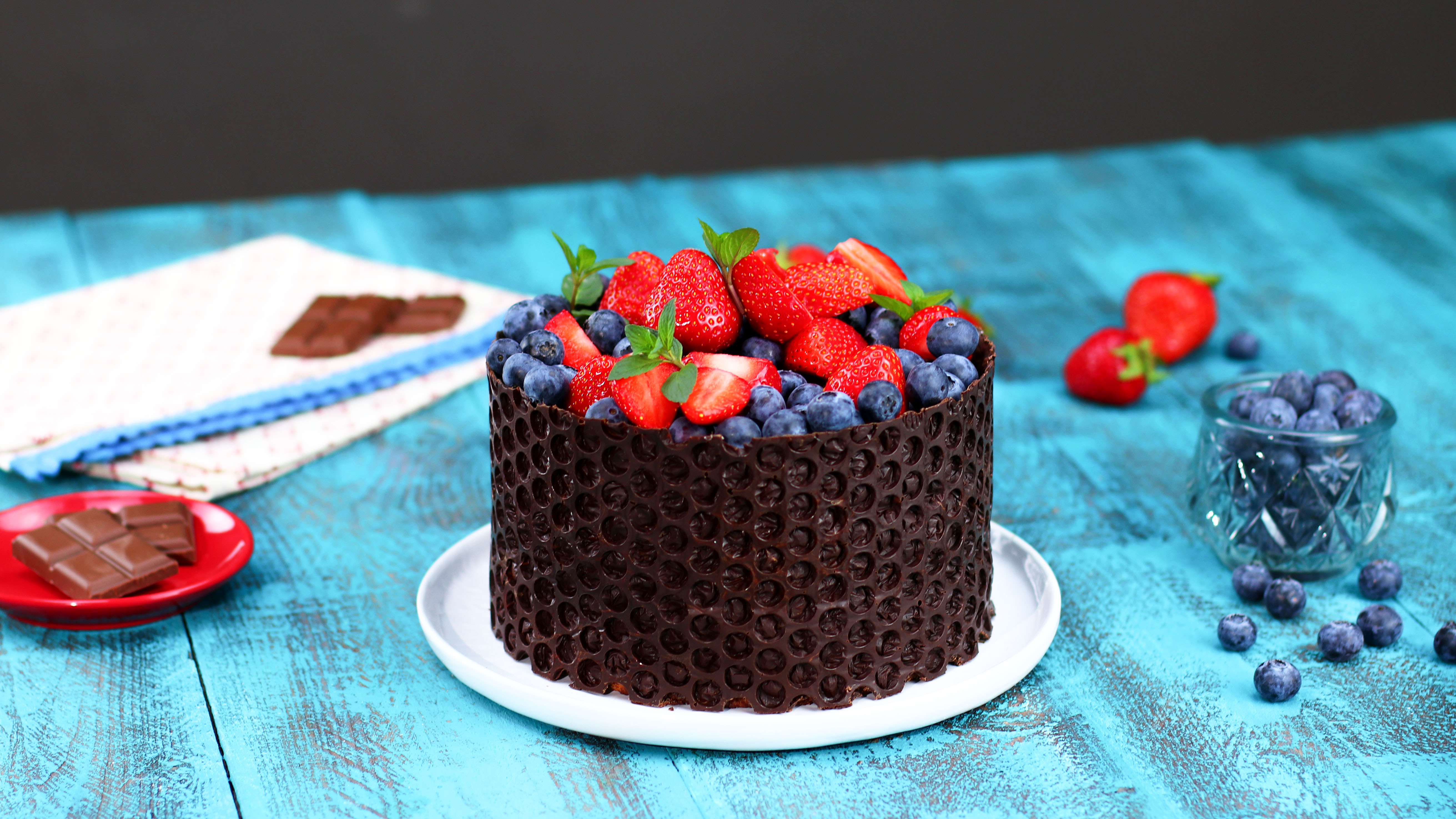 Für die Kuchendekoration schmelze die Zartbitterschokolade über einem Wasserbad ein. In der Zwischenzeit kannst du ein Stück Luftpolsterfolie zurechtschneiden, das lang genug ist, um einmal um den Kuchen herum zu passen, und ihn in der Höhe um etwa zwei Zentimeter überragt. Bestreiche die Luftpolsterfolie auf ihrer strukturierten Seite großzügig mit Schokolade.