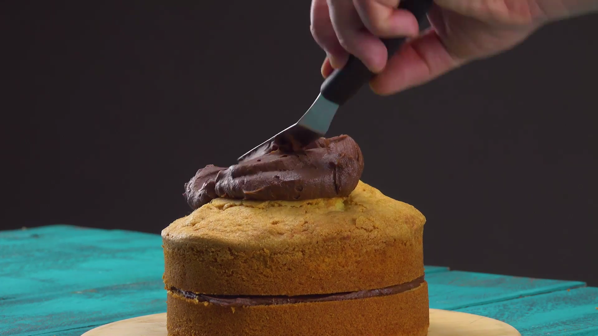 Löffle die Hälfte der Creme auf den aufgeschnittenen Kuchen. Sollte die Creme zu flüssig sein, lass sie eine Weile erkalten. Setze die obere Hälfte des Kuchens auf die Creme und bestreiche nun die Oberseite mit der übrigen Schokoladencreme.