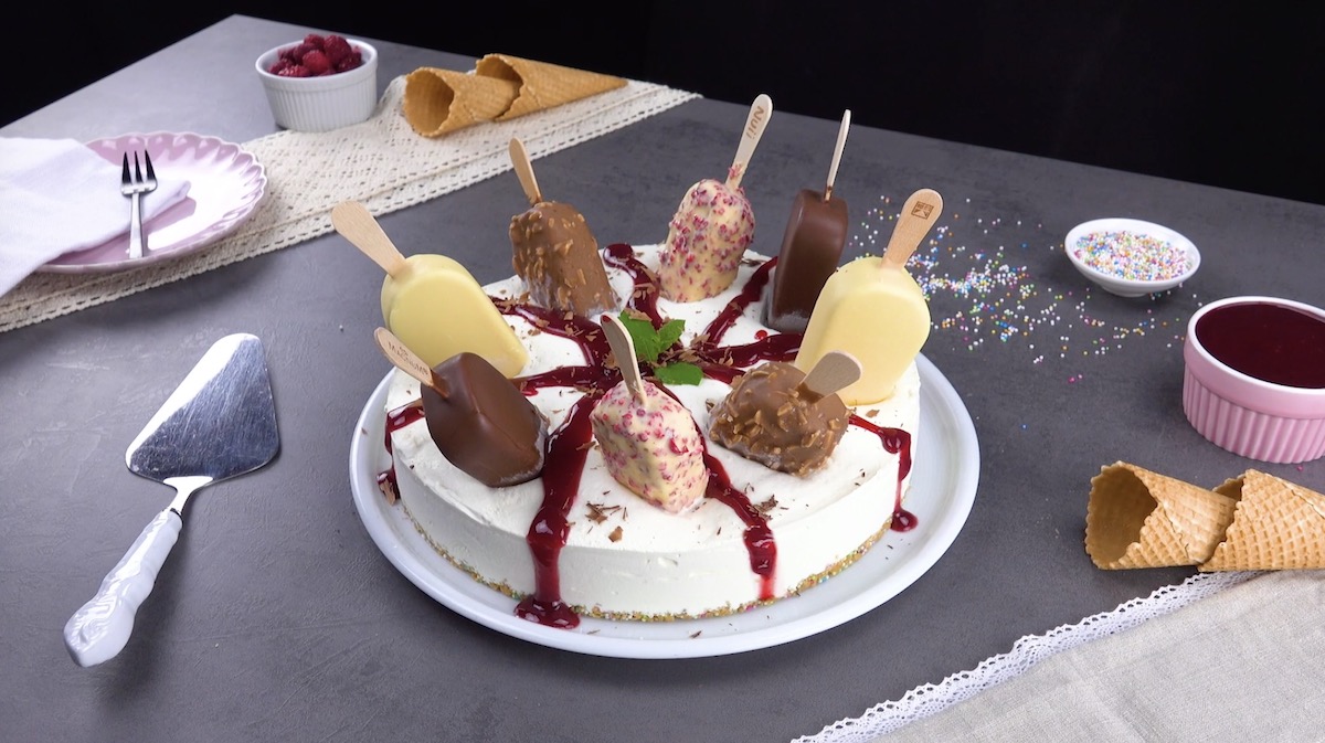 6.) Packe nun 8 gemischte Mini-Magnum deiner Wahl aus und stecke sie mit leichtem Druck von oben in die Masse. Friere den Kuchen anschließend für mindestens 6 Stunden, am besten aber über Nacht, ein. Verziere ihn vor dem Servieren mit Schokoraspel, Himbeersoße und Minzblättern.