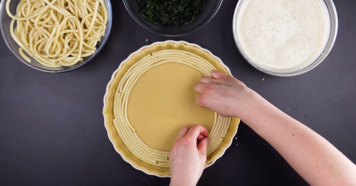 5.) Zum Abschluss kommt eine letzte Makkaroni-Schicht mit Soße, bevor die Quiche-Form bei 180 °C Umluft für 45 Minuten in den Ofen wandert.