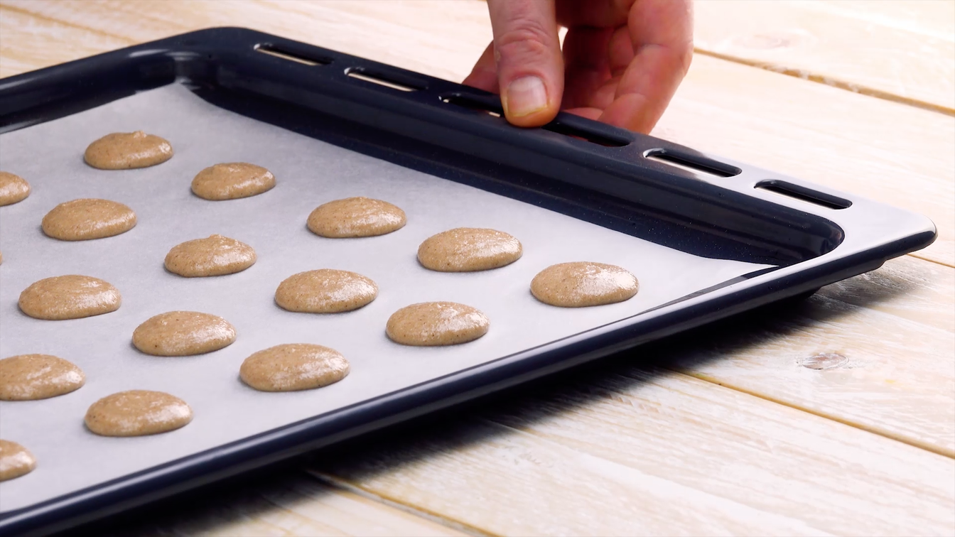 2.) Fülle den Teig in einen Spritzbeutel um und setze in gleichen Abständen kleine Tupfen, ungefähr in der Größe von Euro-Münzen, aufs Blech. Ist das Blech voll, schlage es mehrmals leicht auf deine Arbeitsfläche. Dabei läuft der Teig weiter auseinander und erhält die perfekte Macaron-Form. Außerdem streust du auf die Hälfte der Tupfen etwas Sesam. Backe den Teig dann für 12 Minuten bei 155 °C (Ober- und Unterhitze).