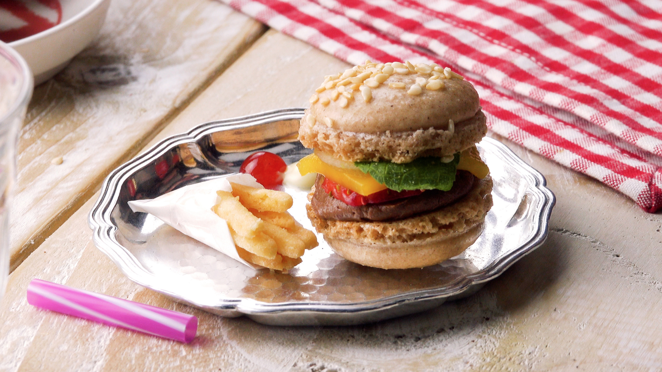 5.) Jetzt geht es an den finalen Part: das Zusammensetzen des Burgers! Spritze Schokocreme auf einen Macaron ohne Sesam, lege eine Scheibe Erdbeere, Mango, mehrere Ringe Birne und ein Minzblatt auf, ehe du einen mit Sesam bestreuten Macaron aufsetzt.