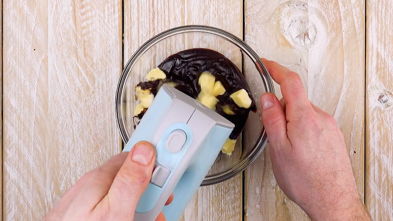 3.) Koche die Sahne auf und füge die Schokolade hinzu. Rühre, bis sie sich vollständig aufgelöst hat. Fülle die Schokomasse in eine Schüssel um und rühre die weiche Butter ein. Die fertige Schokocreme füllst du wiederum in einen Spritzbeutel um.
