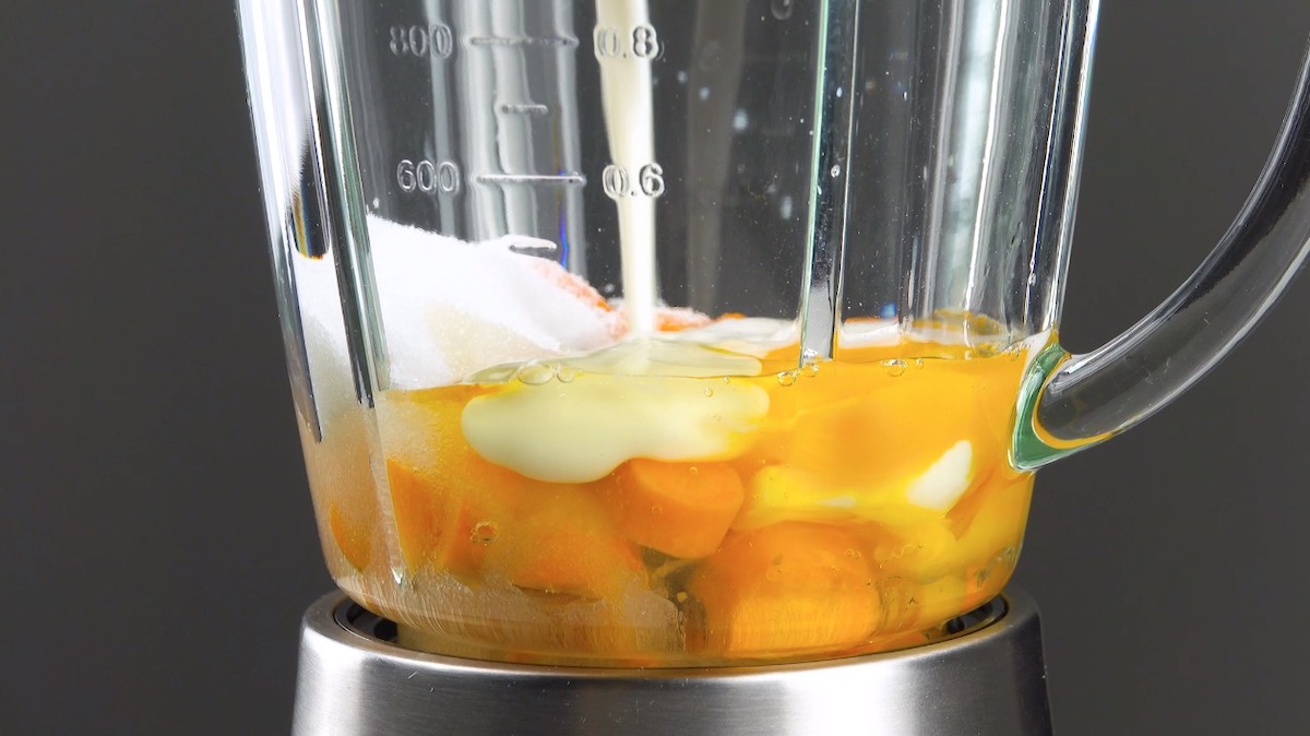 1.) Schäle die Möhren und schneide sie in kleine Stücke. Gib sie mit Milch, Öl, Zucker und den beiden Eiern in einen Mixer und püriere alles.