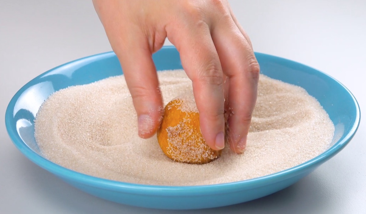 4.) Wenn die kleinen Bällchen goldbraun sind, hole sie aus dem Fett heraus und tupfe das Fett mit Küchenpapier ab. Wälze die Bällchen noch in Zimt und Zucker.