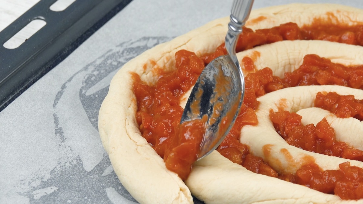 5. Verteile die stückige Tomatensoße in den Zwischenräumen der Spirale.