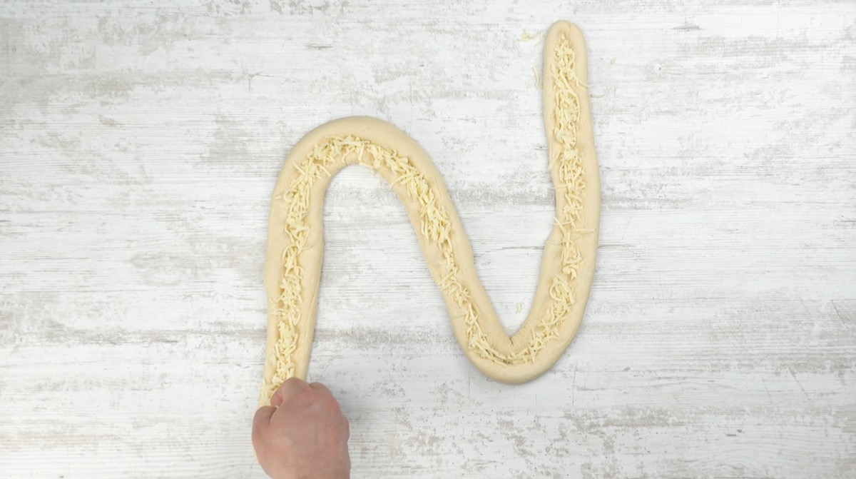 2. Drücke die Teigschlange etwas ein und streue Mozzarella in die entstandene Mulde.