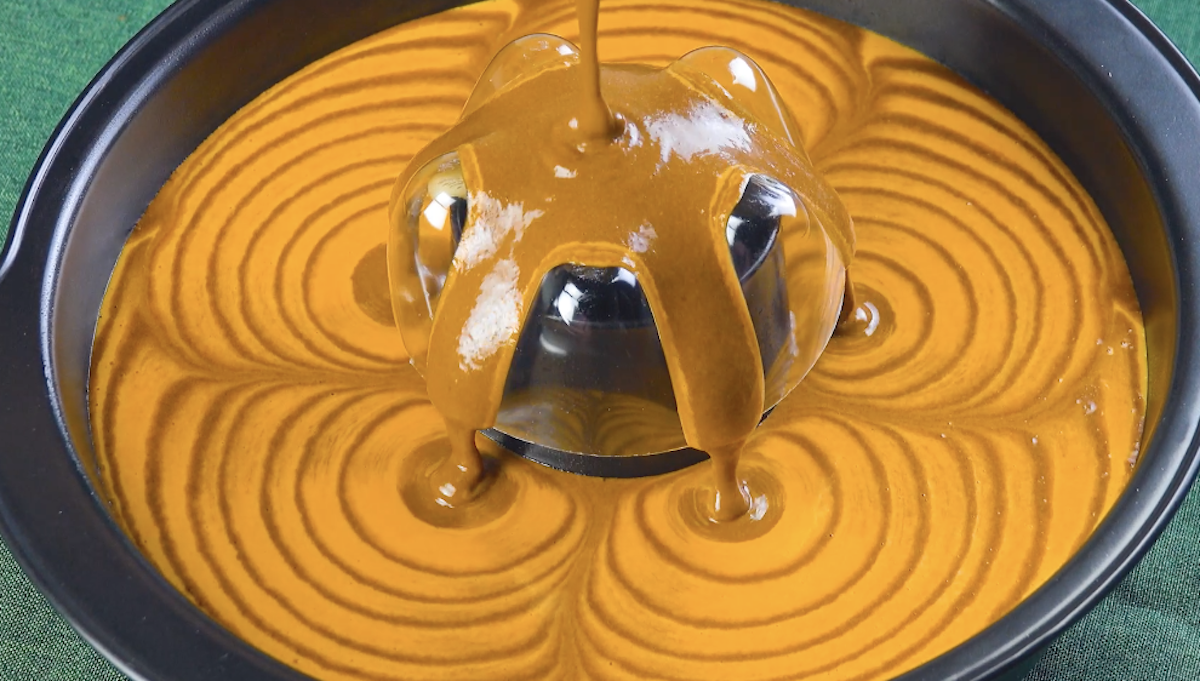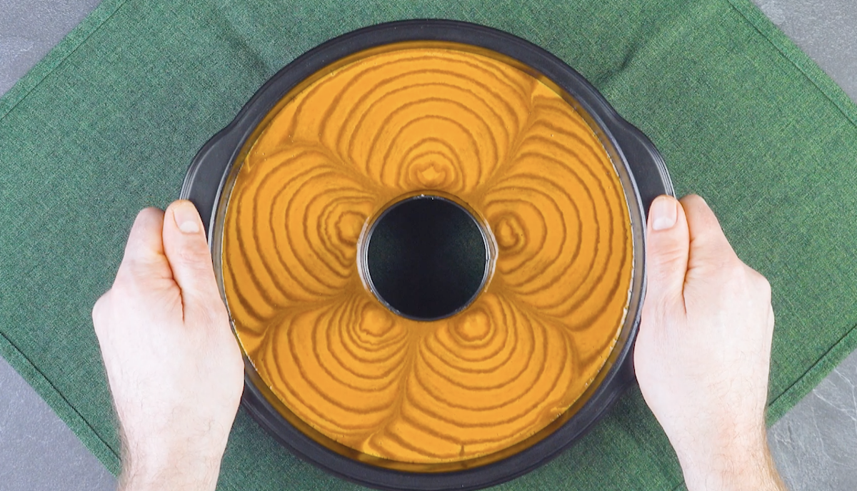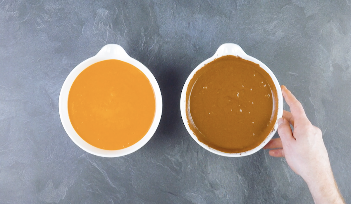 5. Gieße nun abwechselnd den orangefarbenen und den braunen Teig über den Boden der Plastikflasche in die Kuchenform hinein.