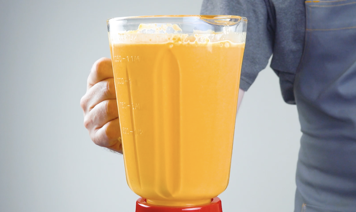 1. Schneide die Karotten in kleine Stücke und gib sie dann in einen Mixer. Füge Eier und Öl hinzu und püriere alles fein.