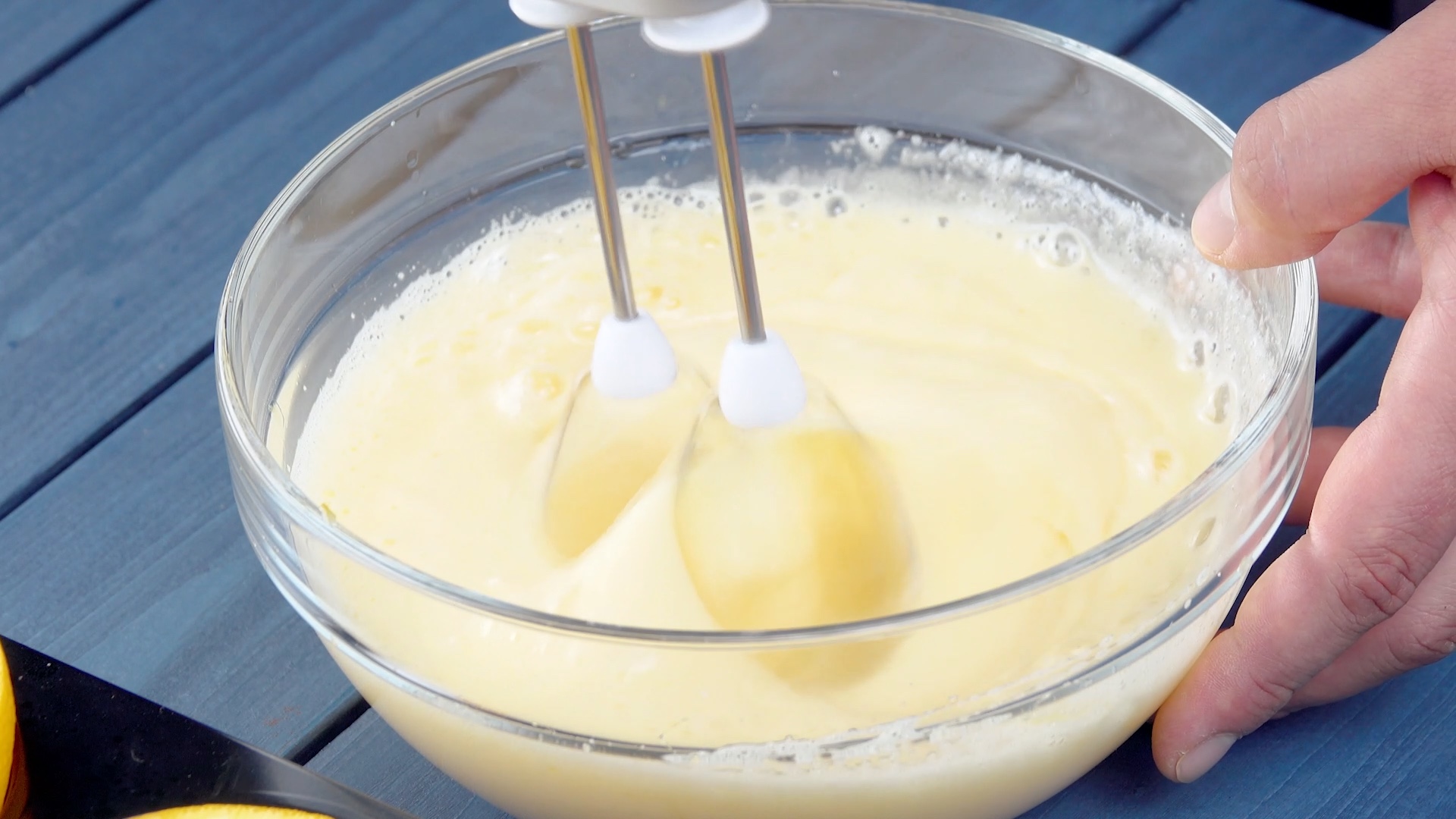 2.) Presse den Saft einer ganzen Orange aus und fülle ihn in eine Schüssel. Gib Eier, 200 Gramm Zucker und Vanillearoma dazu und schlage alles mit einem Handrührgerät schaumig auf.