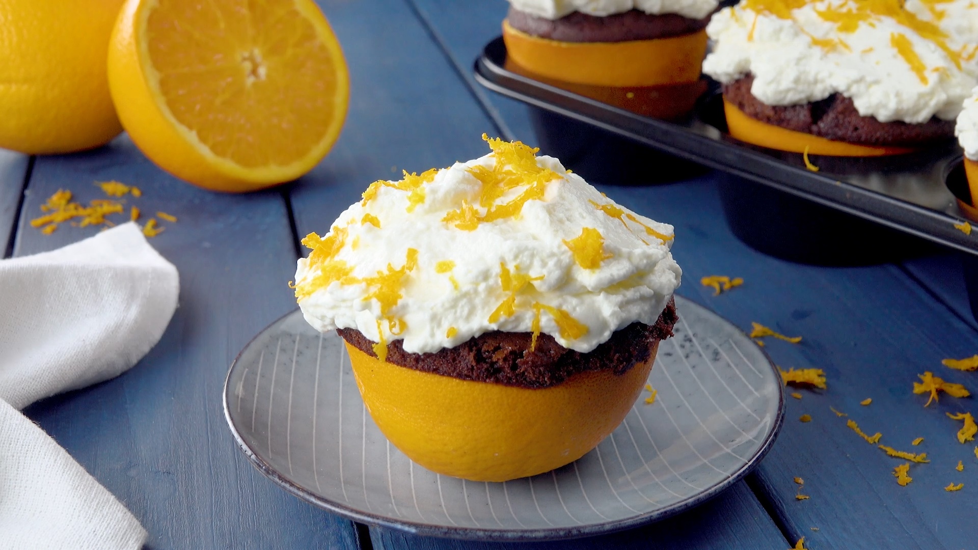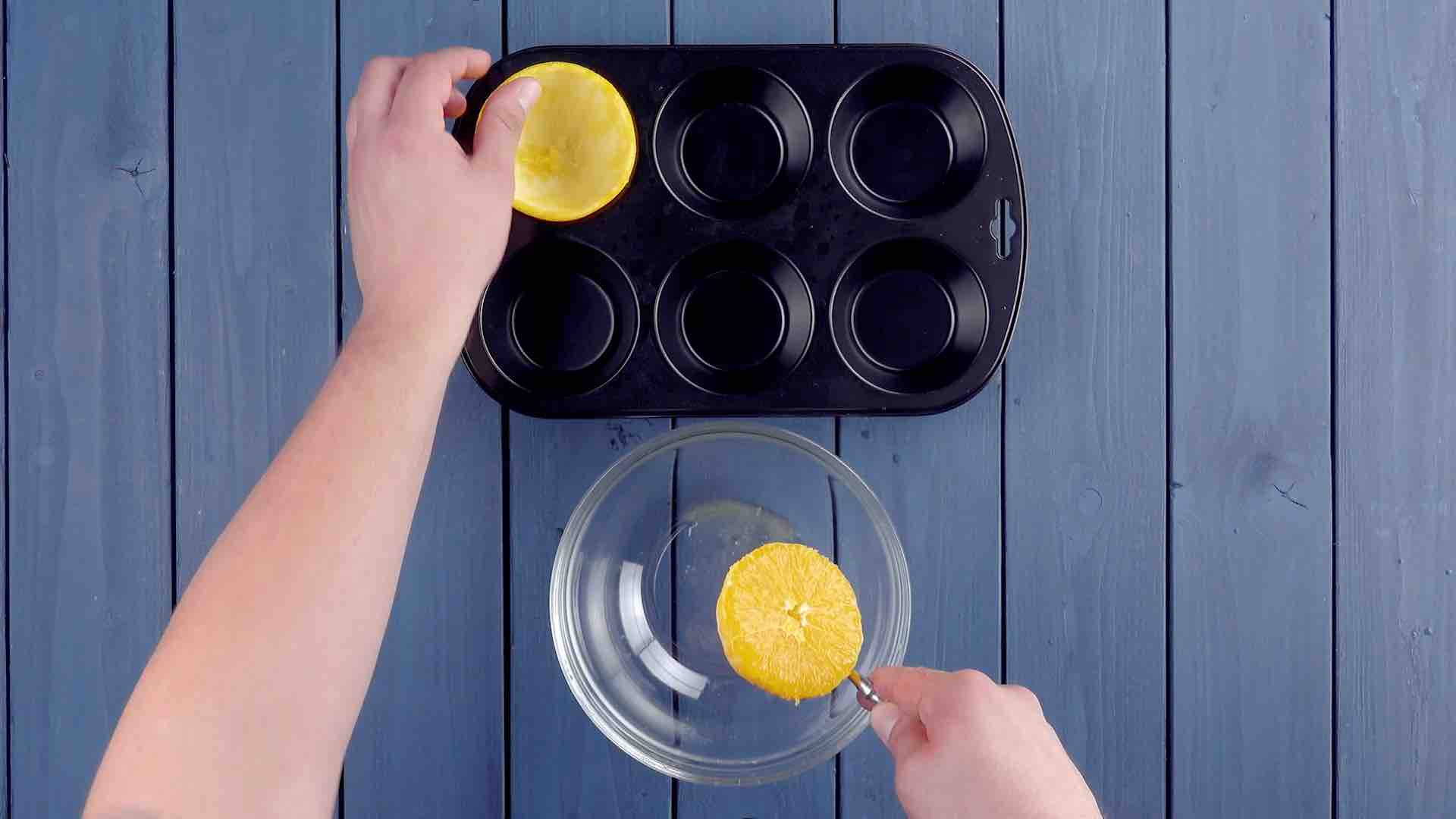 1.) Halbiere drei Orangen und kratze das Fruchtfleisch aus den Schalen. Lege die Mulden einer Muffinform mit den Orangenhälften aus.