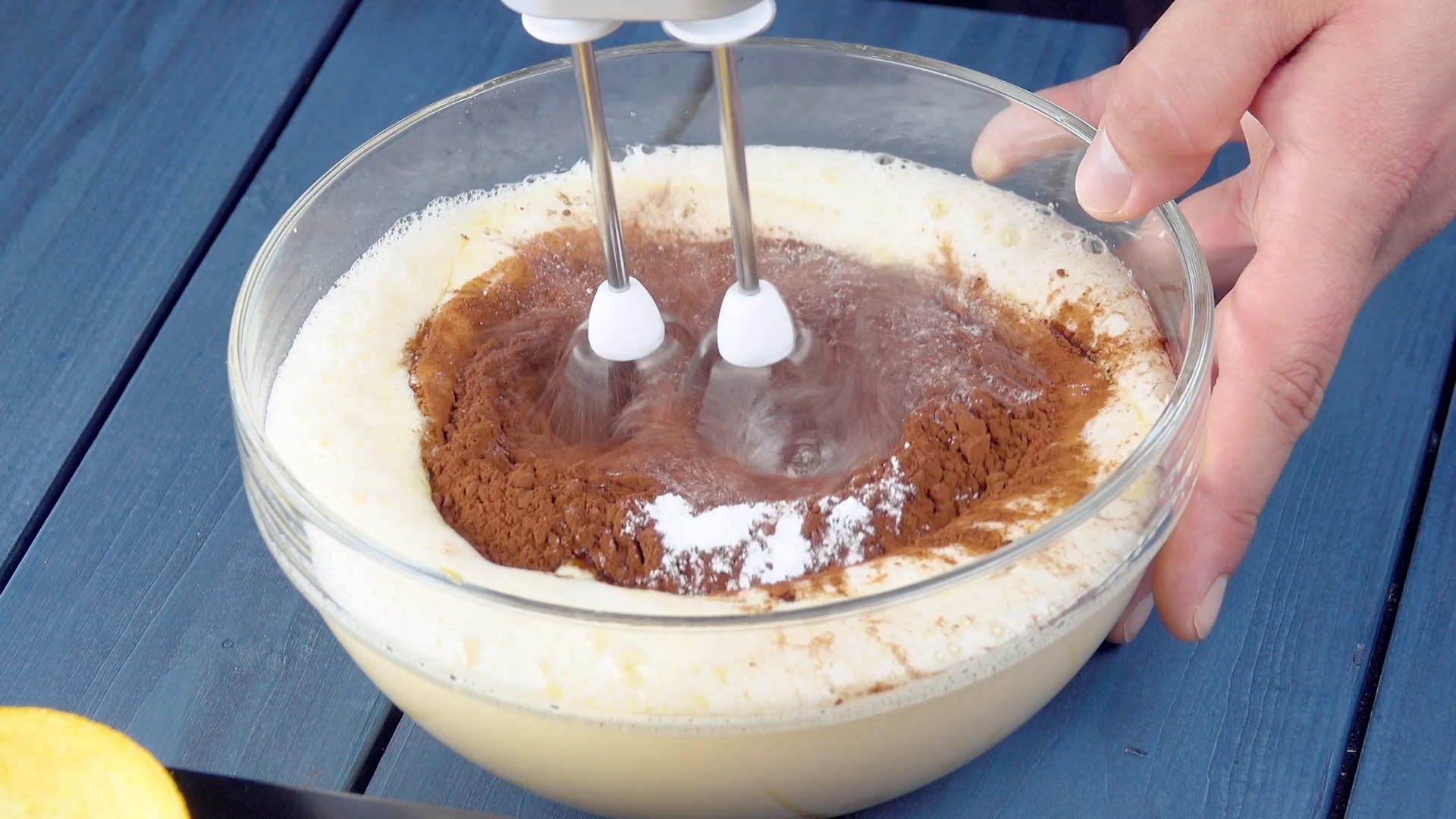 3.) Füge Mehl, Kakao, Backpulver und Butter zum Teig, den du nun erneut mischst.
