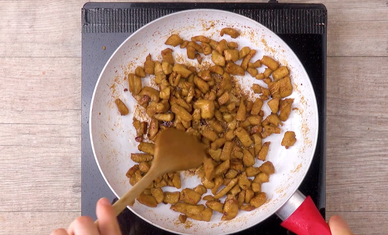 2.) Lass in einer Pfanne Öl heiß werden, brate dann das marinierte Hühnchen gut durch.