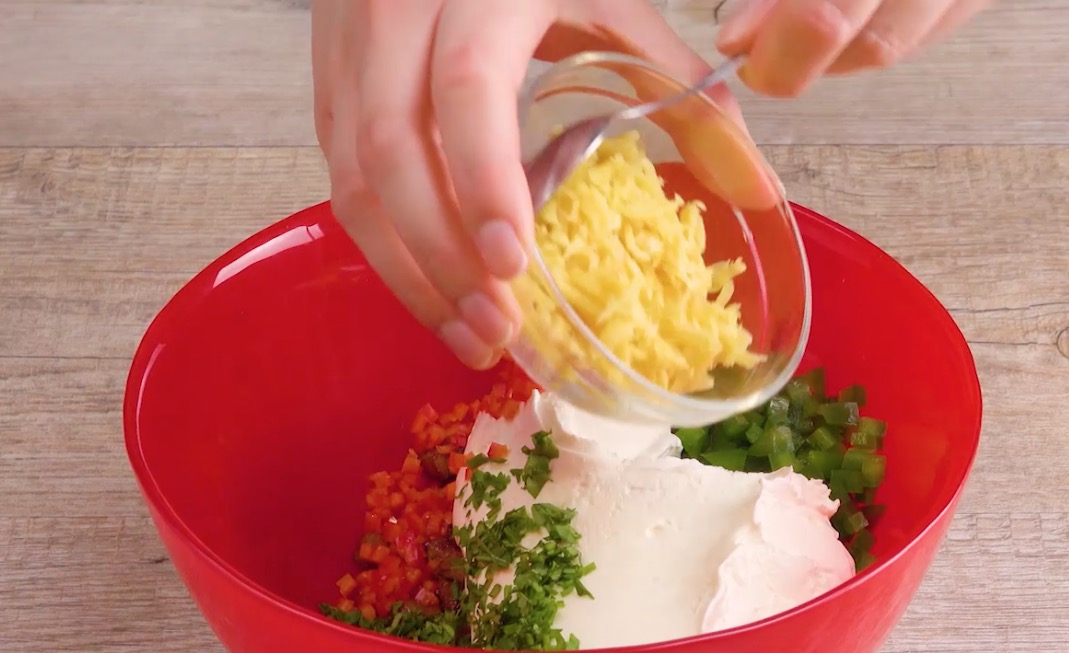 1.) Gib auch hier alle Zutaten (bis auf das Baguette und den Käse für die Garnierung) in eine Schüssel und mische alles sorgfältig durch.