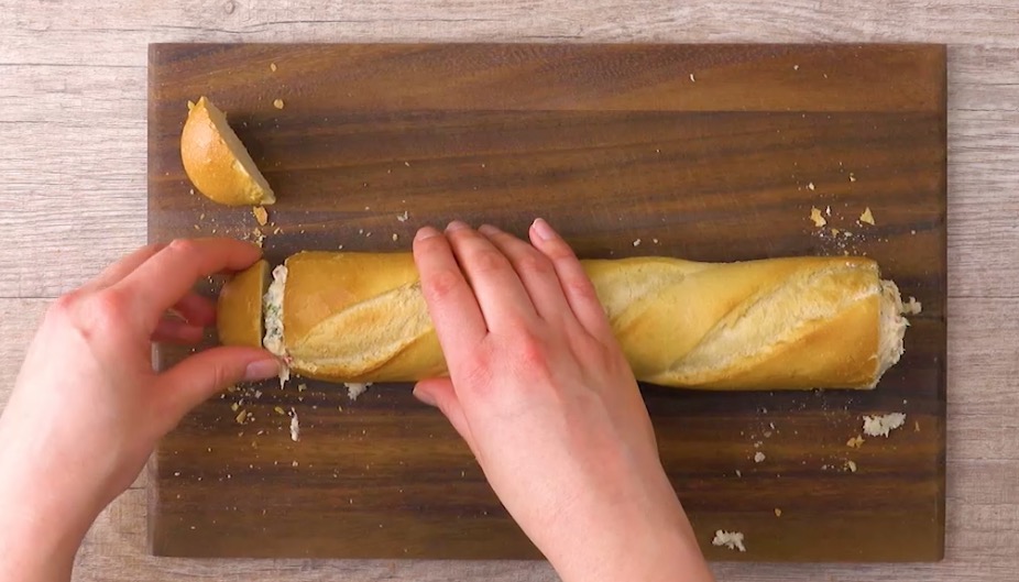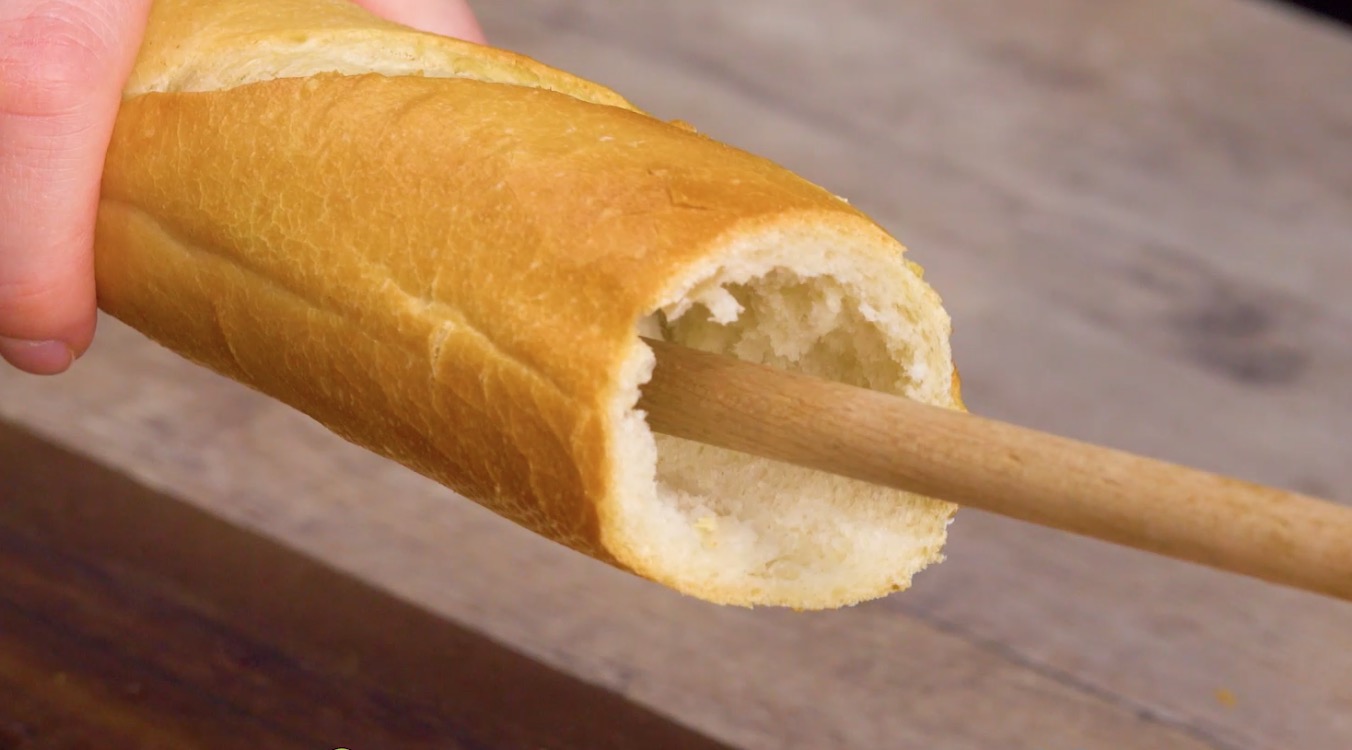 4.) Dann schneidest du beide Enden des Baguettes ab und entfernst das Innere. Schneide dafür mit dem Messer um das Innere der Brotstange herum und drücke es anschließend mit dem Stiel eines Kochlöffels heraus. Das Innere kannst du anderweitig verwenden.