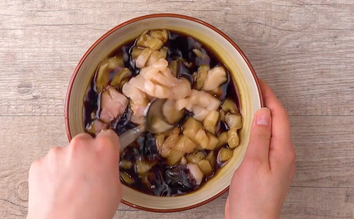 1.) Schneide zuerst die Hühnerbrüste in feine Würfel. Danach mischst du Cola und Sojasoße miteinander und gibst das Hühnchen in die Marinade.