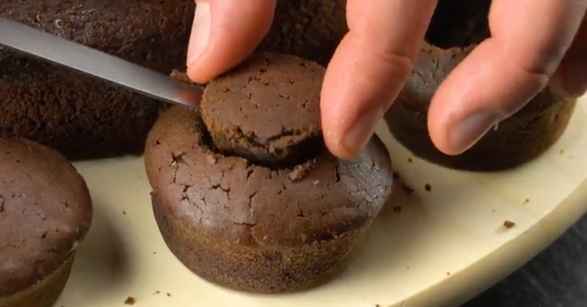 3.) Schneide einen kleinen „Deckel“ aus den Muffins heraus, höhle sie innen aus, fülle sie mit M&Ms und setze den Deckel wieder drauf.