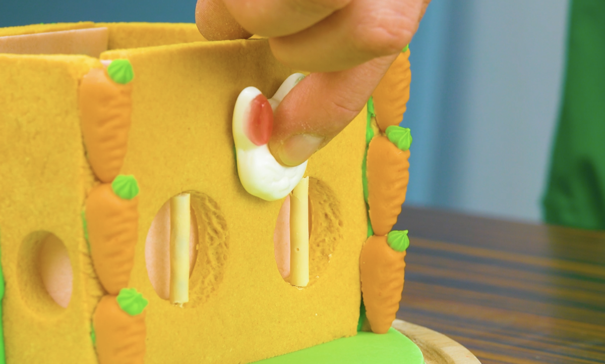8. Rolle grünen Fondant rund aus, lege ihn auf ein Brett oder eine Kuchenplatte und stelle die zusammengeklebten Wände darauf. Klebe außerdem das ausgestochene Viereck als Tür mit Zuckerguss an das Haus. Verziere das Haus des Weiteren noch mit Karotten-Fondant, Schaumgummi-Hasen, Schokoladeneiern und Mikado-Stäbchen in den Fenstern.
