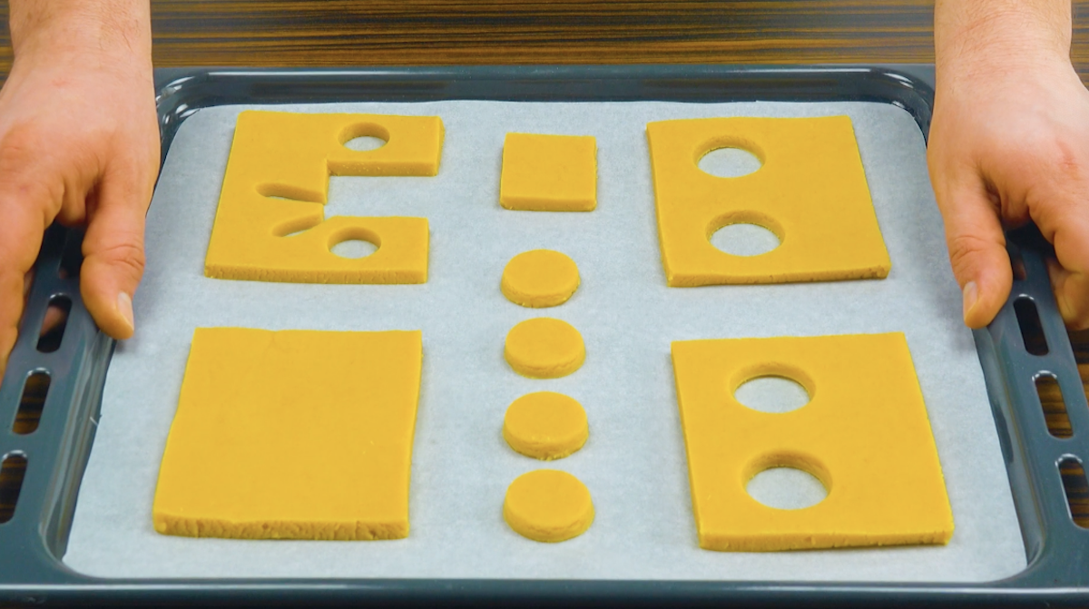 3. Bestäube die Arbeitsplatte mit Mehl und rolle den Teig ca. 2-3 mm dick aus. Schneide aus dem Teig mithilfe eines Esspapiers als Schablone (13 x 10 cm) vier Rechtecke aus. Lege diese auf ein mit Backpapier ausgelegtes Backblech. Stich aus den Teigrechtecken dann Kreise, ein Quadrat und Hasenohren aus, wie in folgendem Bild zu sehen. Diese Teige werden später die Wände des Osterhauses sein.