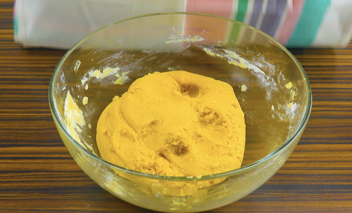 2. Gib Mehl und Puderzucker in eine Schüssel, füge das Butter-Honig-Gemisch zusammen mit Ei, Eierlikör und Kurkuma hinzu und verknete alles zu einem gleichmäßigen Teig. Forme den Teig zu einer Kugel, wickle diese in Frischhaltefolie ein und lege sie für 30 Minuten in den Kühlschrank.
