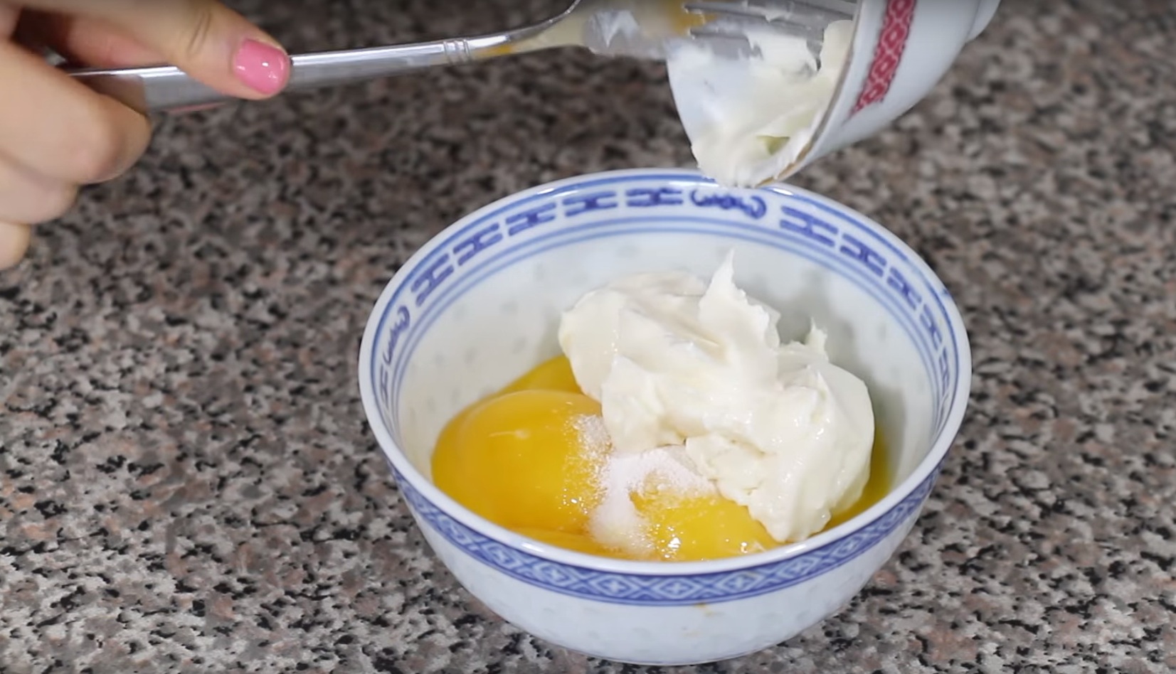 So wird es gemacht: Gib den Frischkäse und die Prise Zuckerersatz zu den 3 Eigelben.