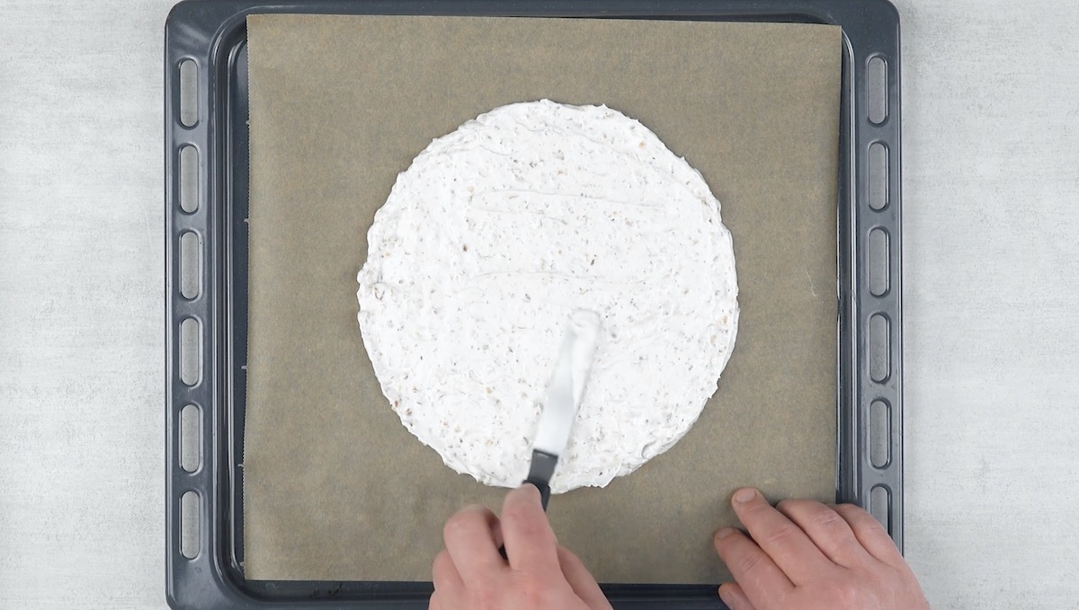 1. Schlage für den Boden die Eiweiße mit Zitronensaft und Zucker schaumig. Verrühre die klein gehackten Nüsse mit Maisstärke und hebe sie unter die Eiweiß-Mischung. Forme aus diesem Teig vier gleich große Böden und backe diese für 120 Minuten bei 120 °C Umluft. Lass die Böden anschließend abkühlen.