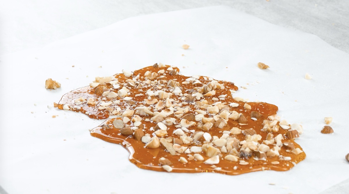 2.4 Erhitze für das Karamell Zucker mit Wasser und koche es so lange, bis braunes Karamell entstanden ist. Gieße dieses dann auf Backpapier und lass es etwas abkühlen, bevor du es mit den grob gehackten Nüssen bestreust und komplett auskühlen lässt.