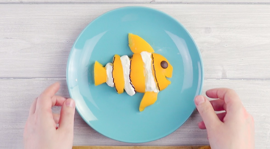 2.) Jetzt setzt du den Fisch zusammen, wobei zwischen die Pfirsichscheiben je ein Klecks Joghurt kommt. Am Schluss kommt der Schokodrop als Auge dazu. Wenn du möchtest, kannst du die Streifen mithilfe von Schokostreuseln noch ein wenig hervorheben. Sieht fast aus wie Nemo!