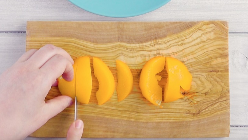 1.) Schneide von der einen Pfirsichhälfte eine breitere Spalte ab. Das wird der Kopf. Zaubere ihm mit einem scharfen Messer ein Lächeln ins Gesicht. Vom restlichen Pfirsich brauchst du nun noch zwei Spalten für den Körper sowie die Flossen.