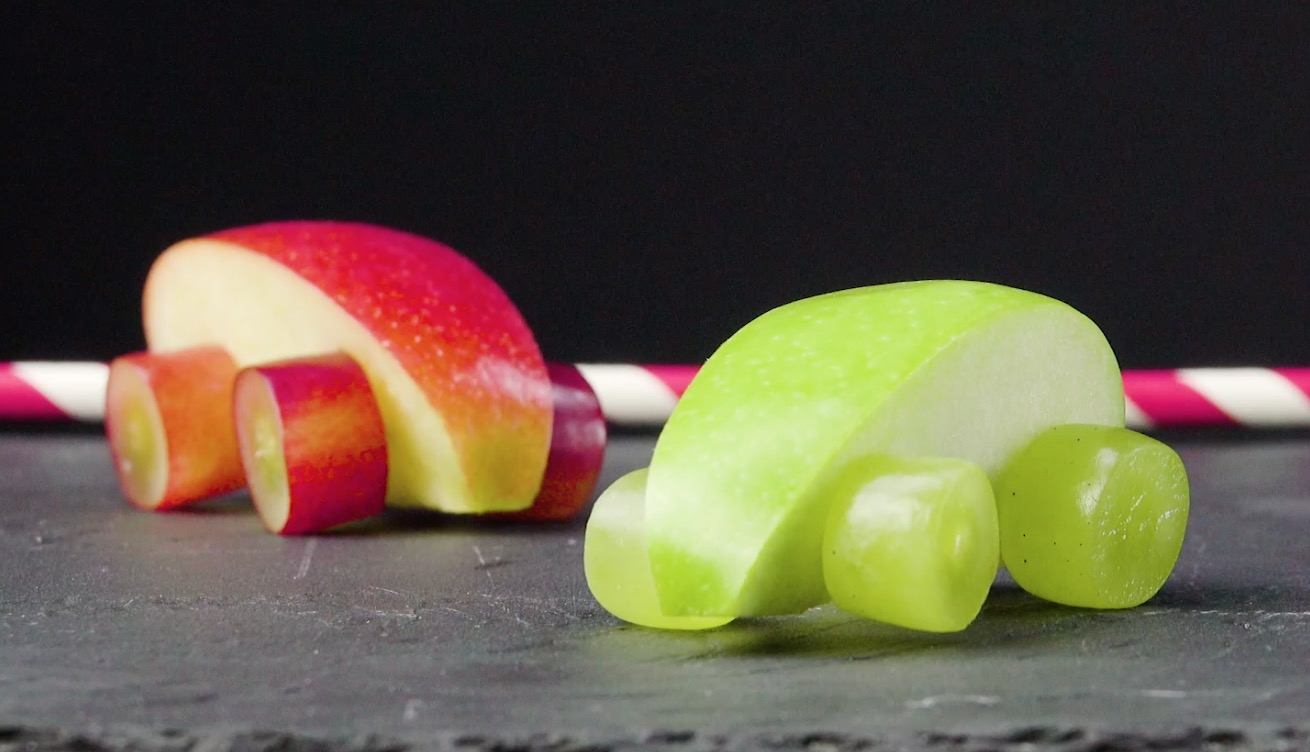 Entferne zuerst das Kerngehäuse von der Apfelspalte und schneide dann die Trauben in 4 dicke Scheiben. Halbiere anschließend einen Zahnstocher und fixiere die Traubenscheiben damit wie Räder an den Achsen des Apfelautos.