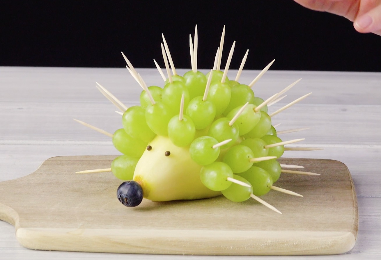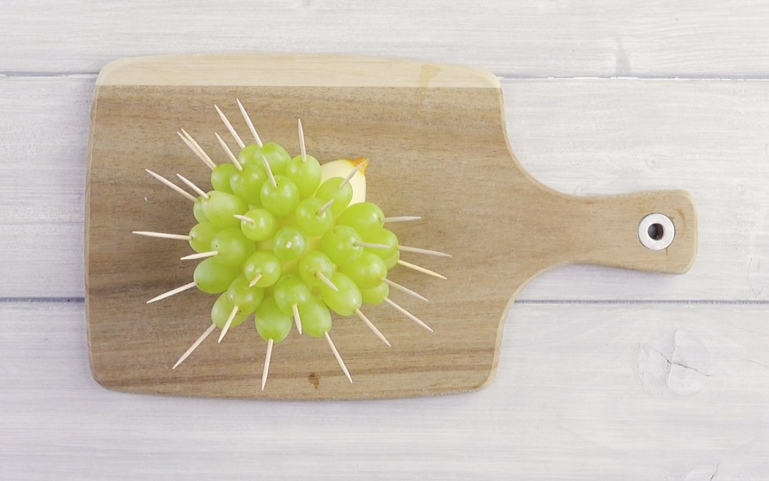 1.) Schäle zunächst die Birne, ohne den Stiel zu entfernen. Stecke nun jeweils eine Traube auf einen Zahnstocher und dann alle nebeneinander in die Birne. Spare dabei die Spitze der Birne aus. Sie wird später die Igelschnauze sein.