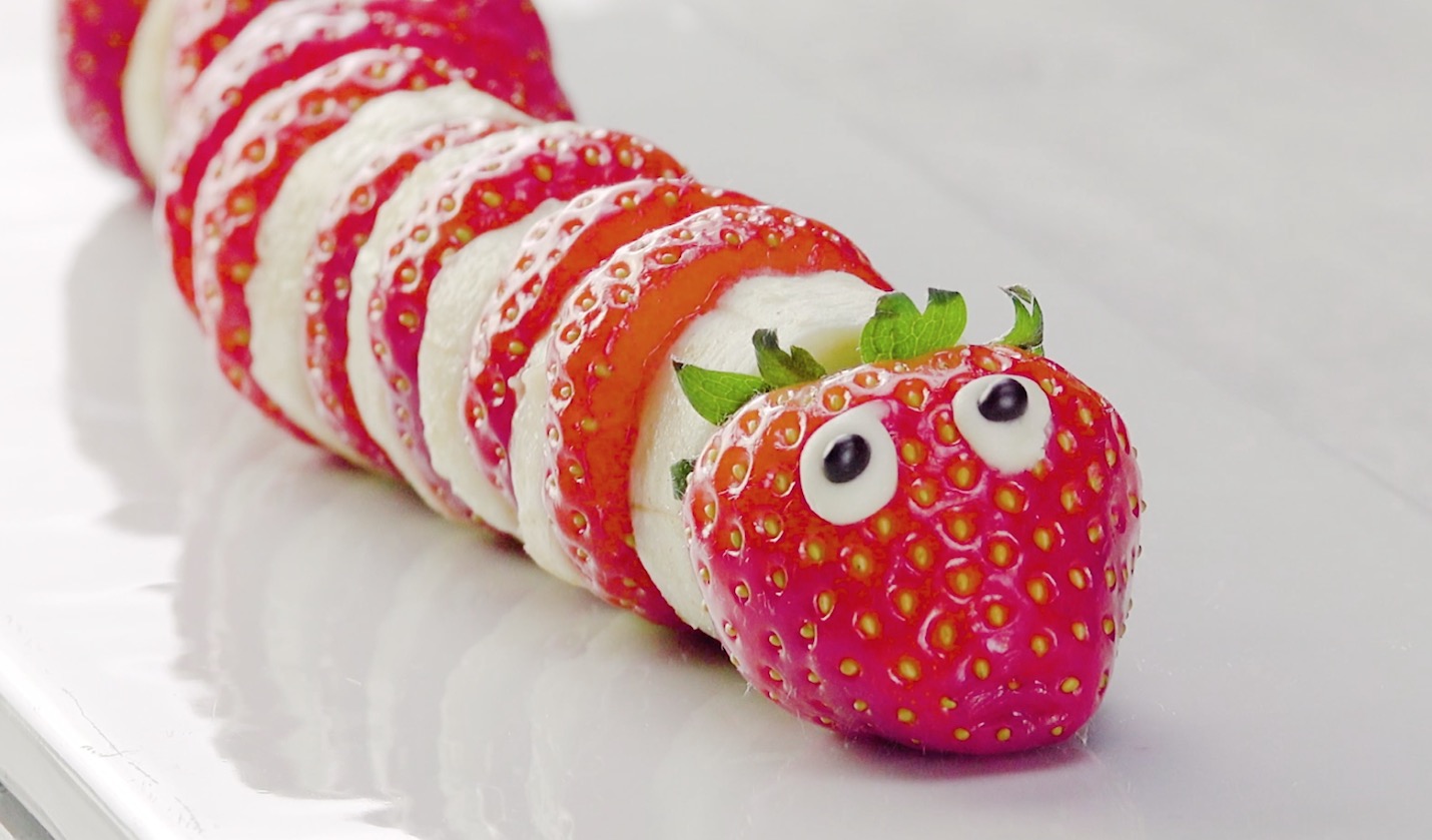 2.) Schneide von der anderen ganzen Erdbeere nun den Strunk ab und „baue“ die Raupe zusammen: Dafür setzt du die Erdbeere mit den Augen an den Anfang und fügst dann Bananen- und Erdbeerscheiben abwechselnd dahinter an. An das Ende setzt du die zweite ganze Erdbeere. Fertig ist die bunte Raupe!